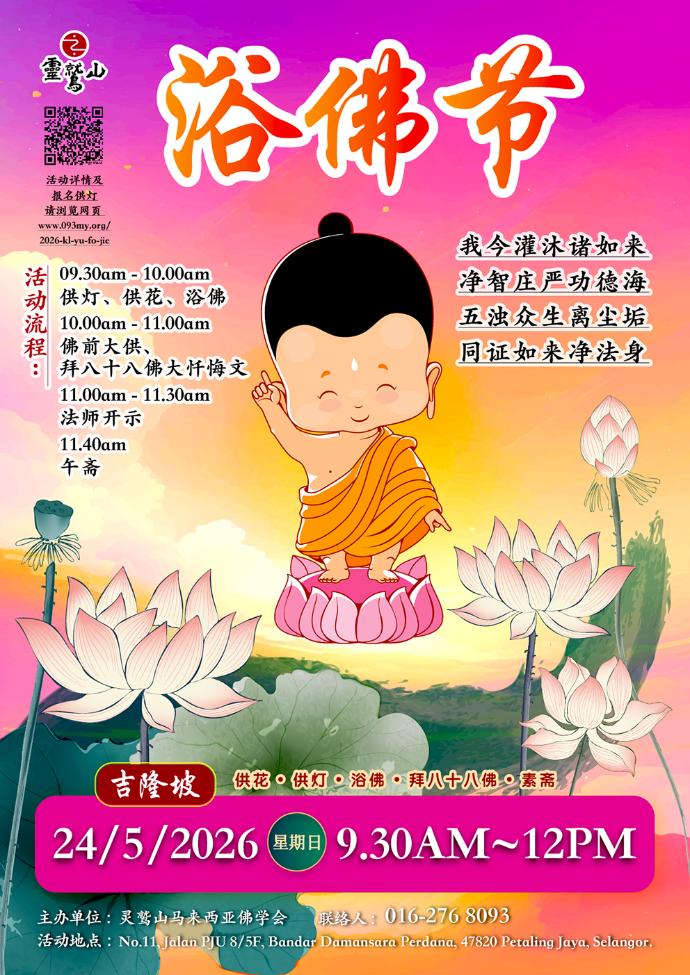 灵鹫山马来西亚佛学会,在每年的佛诞日都举办浴佛节纪念仪式,庄严而温馨,我们感恩佛的智慧与慈悲的同时,也提醒自己要以佛为典范,洗清自己的五浊习气,抛下执着,早日成就佛道。