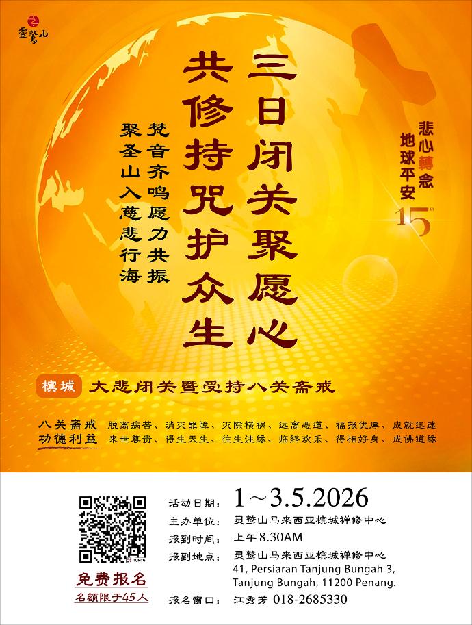 2026年灵鹫山大悲闭关将于5月1日启建,至5月3日圆满。欢迎社会大众报名参加灵鹫山马来西亚槟城禅修中心一起共修,或随喜共修一天、两天,共同寻找身心安定的方式。