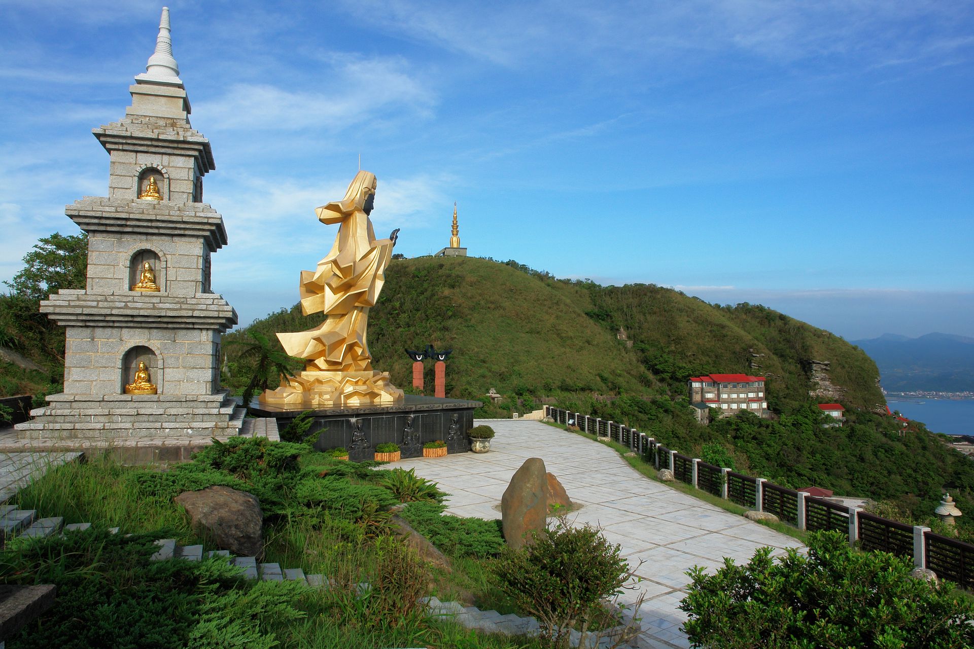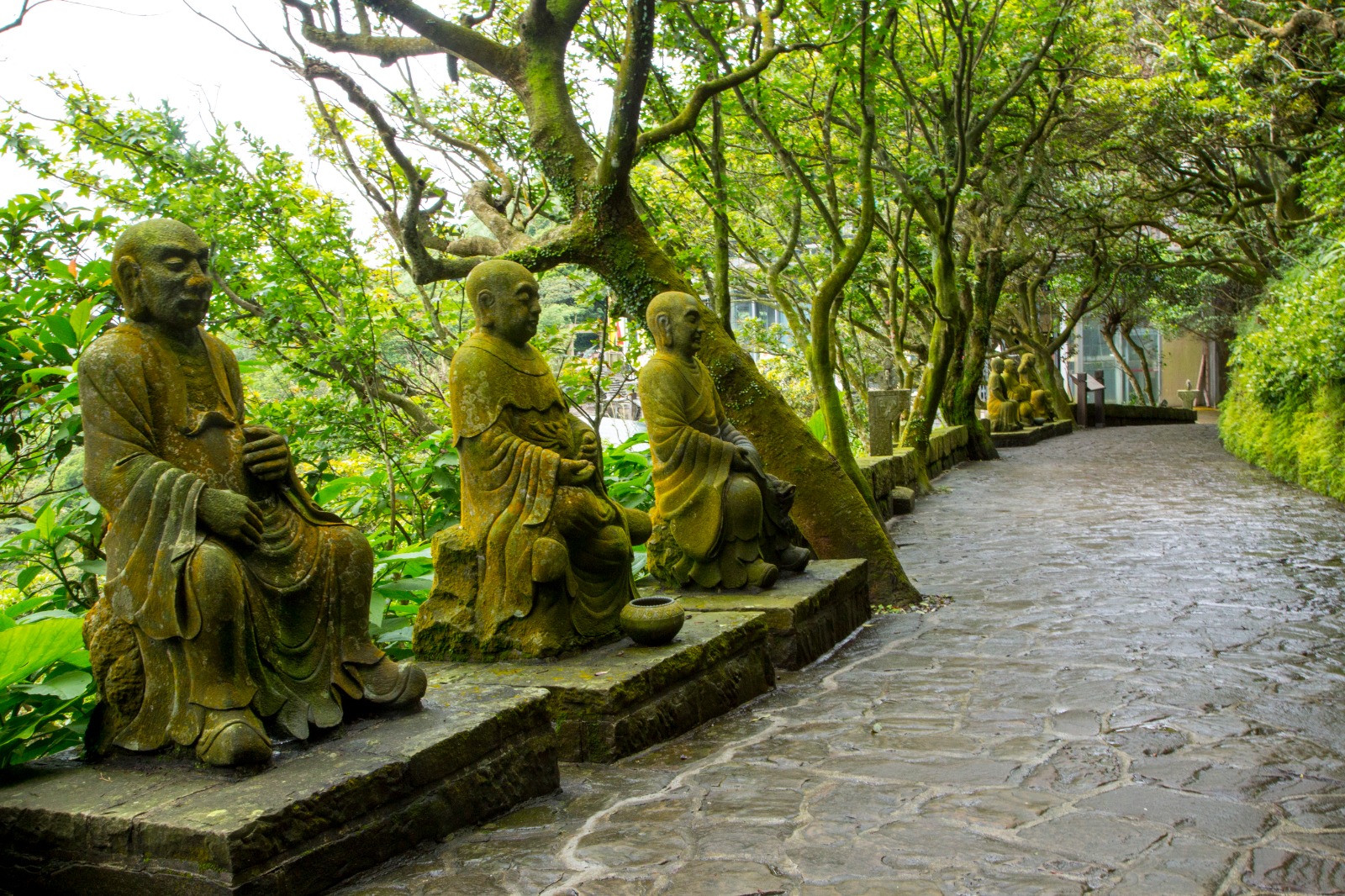 沿着到场朝山步道,尽头即为开山缘起的洞窟,为当年心道法师断食闭关的「法华洞窟」。一路走去,尽见红瓦石屋、山间林道的石板路、错落安置着青斗石雕的五百罗汉、石砌舍利塔林、来自斯里兰卡的第三代「摩诃菩提圣树」,以及缅甸白玉石佛像等。诸种象征修行成就的圣迹圣物安奉在自然和谐、纯朴宁静的山海之巅,展现新时代的禅风。